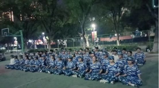 夜幕降临,操场灯火通明,身着蓝白迷彩服的新生以连队为单位,在篮球场及跑道区域有序就坐,参与夜间军训主题教育活动。迷彩方阵横纵成行,在灯光映照下形成壮观画面。学生们身姿挺拔、神情专注,展现出青年学子的昂扬风貌。现场氛围庄重而充满凝聚力,既有军训的严肃纪律,又不失青春活力。