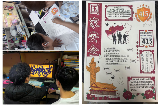 理论学习后,学生党员深入宿舍开展国家安全教育实践活动。通过组织观看主题影片《惊蛰无声》,以真实案例增强同学们的安全防范意识与辨别能力;开展手抄报集体创作,将总体国家安全观融入生动图文,在创作交流中深化认知,让国家安全知识走进宿舍、融入日常,营造“人人学国安、人人护国安”的浓厚氛围。并结合网络安全、宿舍安全及日常学习生活中的信息保密风险讲解防范要点对宿舍进行安全隐患排查,督促整改违规用电等问题,切实压实安全责任。