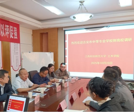 2025 年 10 月 23 日上午,吉安中等专业学校涂强校长、杜琦副校长等一行六人到访我校土木工程学院,双方围绕技能大赛、升学帮扶与专业建设开展座谈。土木工程学院教学副院长及各系系主任参会。