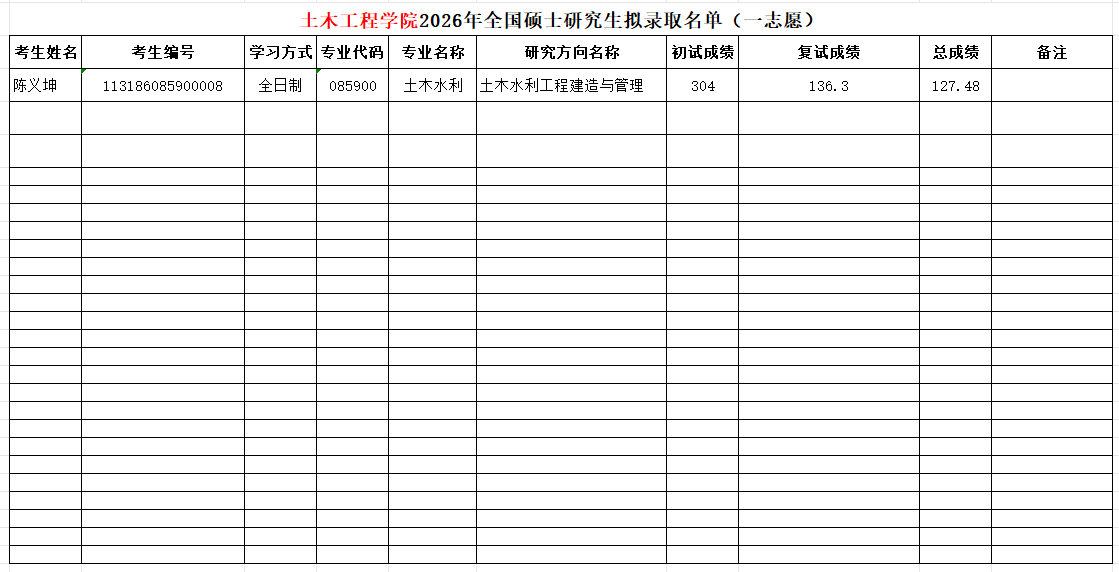 土木工程学院2026年全国硕士研究生拟录取名单(一志愿)